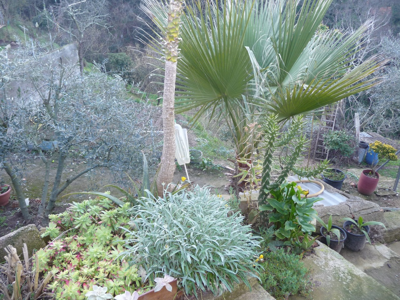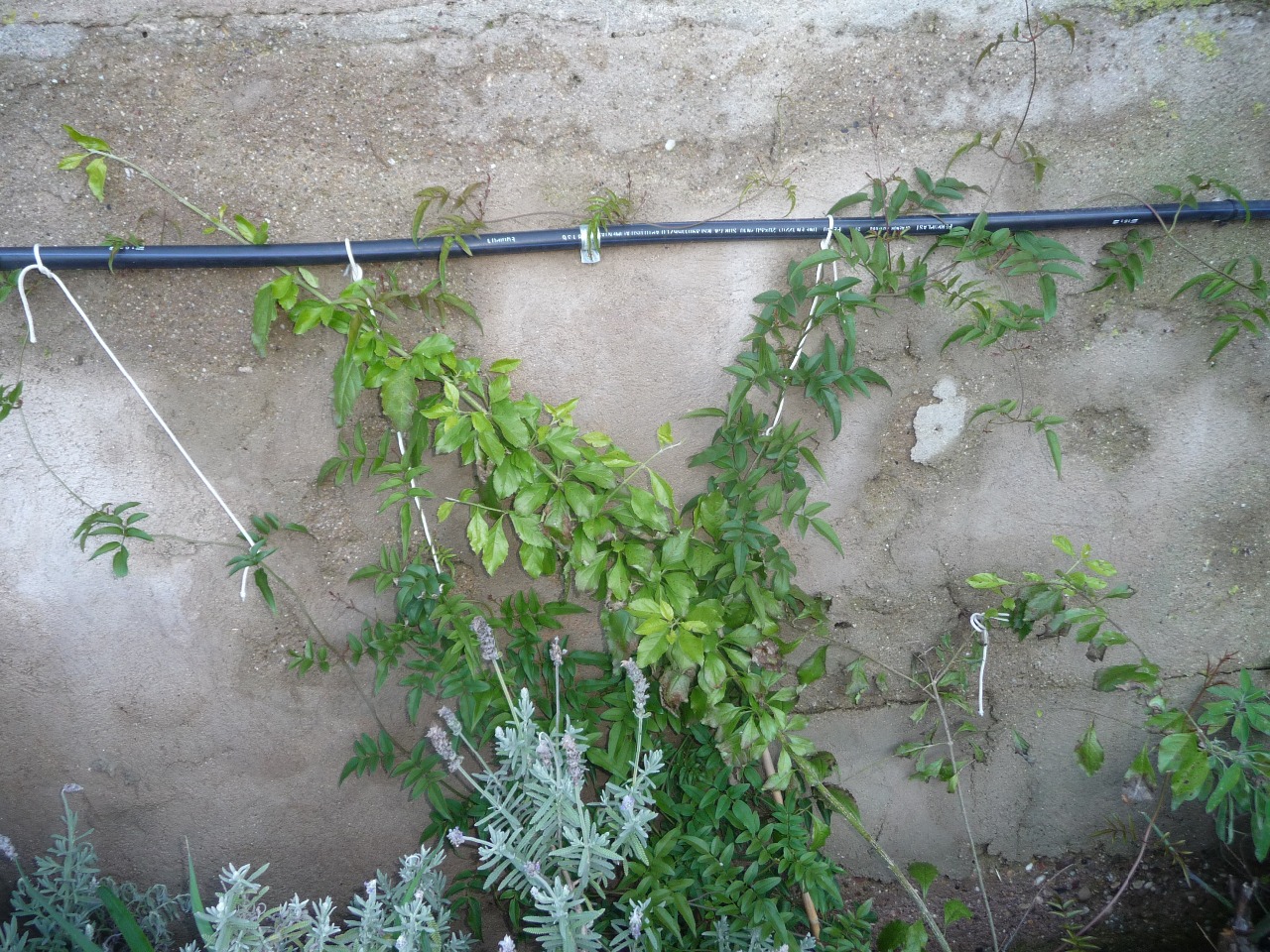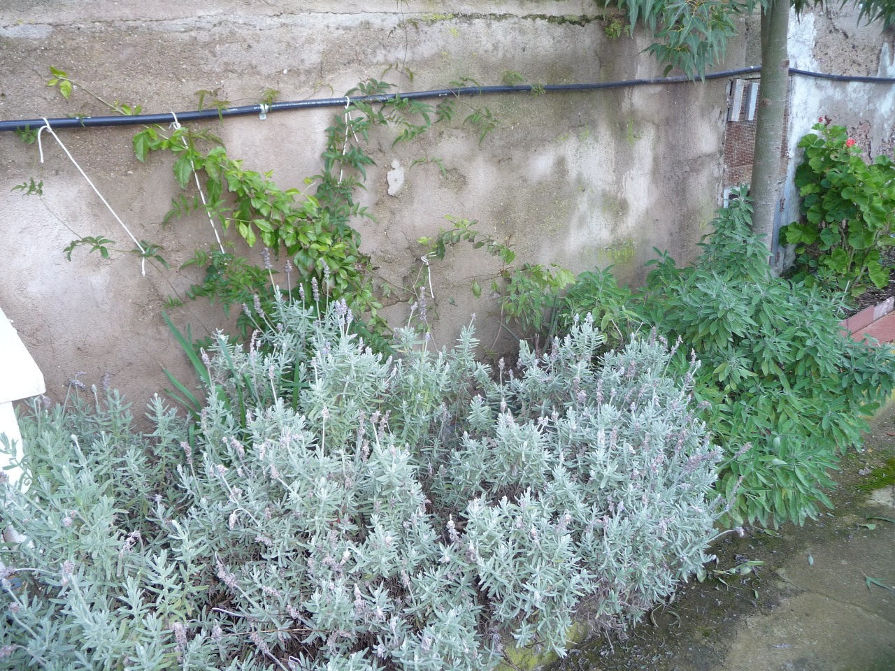 Al lado del fregadero hay una lavanda bastante grande (Lavandula dentata) y a continuación, junto a los pies de un árbol botella de Queensland (Brachychiton rupestris), hay una salvia común (Salvia officinalis). Detrás de ellas, hay un jazmín que compré el año pasado y una Duranta repens que he conseguido a partir de un esqueje que cogí de un parque de Malgrat de Mar. La verdad es que no me imaginaba que fuera tan resistente ya que ha pasado el invierno sin perder prácticamente ninguna hoja a pesar de que algunas webs dicen que es de zona 10. Al lado de ella tengo previsto poner una buganvillea a ver si es capaz de sobrevivir en esta zona y que ahora está pasando el invierno en mi casa de Badalona (Zona 10), junto a otras plantas sensibles al frío como la Plumeria sp., los H. rosa-sinensis y la planta de navidad.