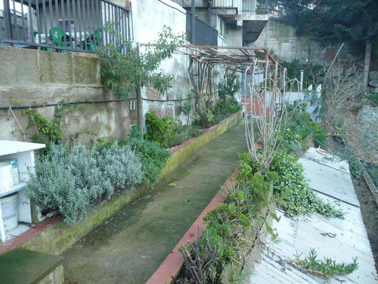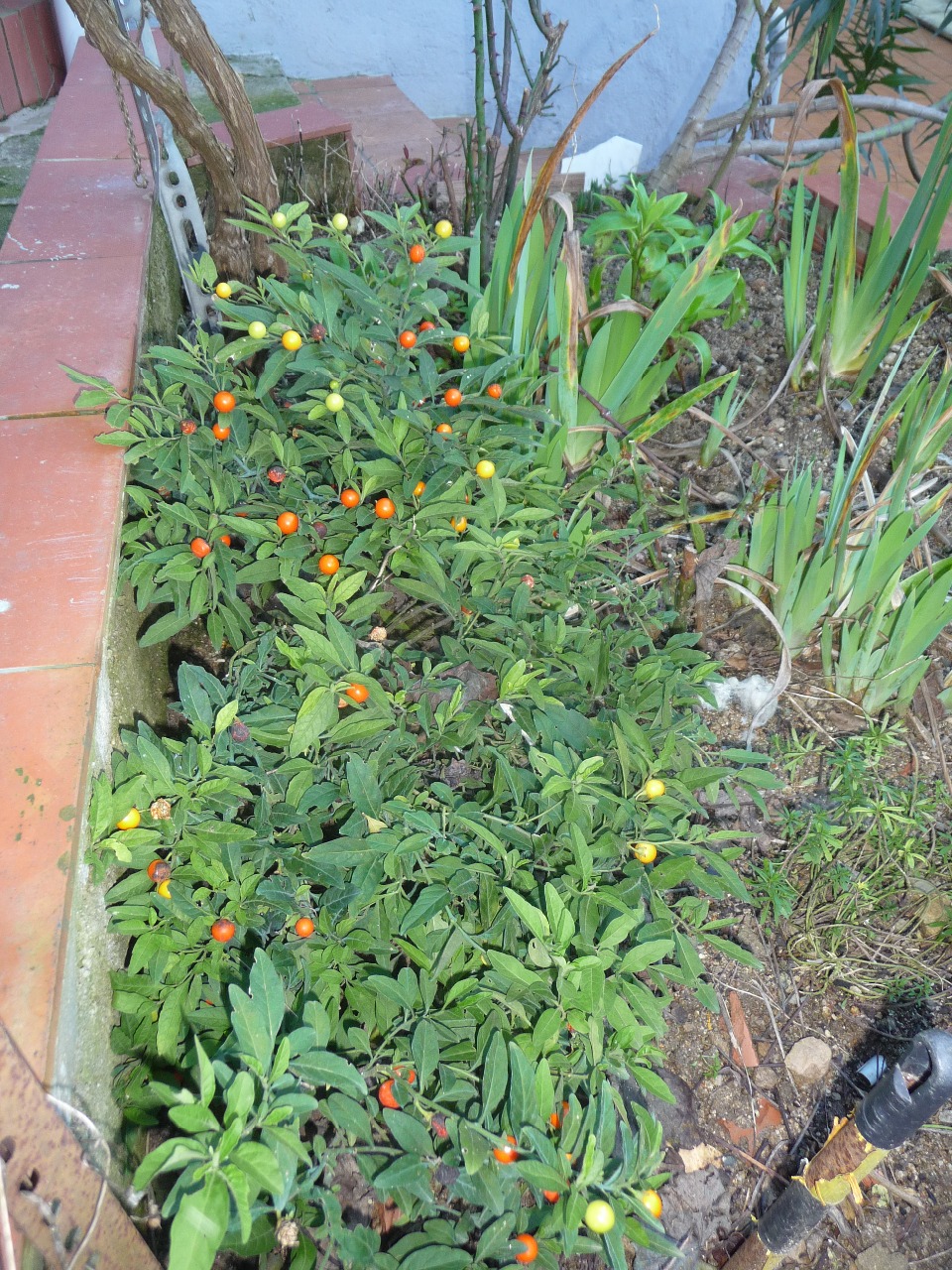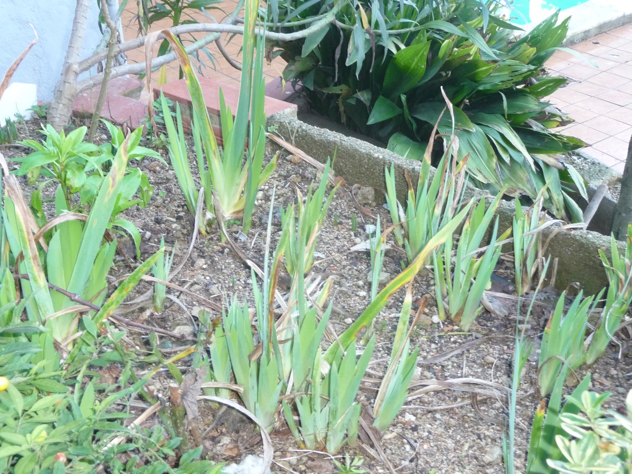 A continuación hay algunas rudas, rosales por supuesto, un crinum que me traje de unos huertos de Malgrat de Mar, una bola de nieve que todavía no ha florecido (Viburnum opulus), un pequeñito árbol de júpiter (Lagerstroemia indica), al lado del celindo (Philadelphus virginalis) hay unas cañas indicas que me traje de Jordania y que creo que son amarillas totales, santolina y también hay un floripondio (Brugmansia candida) que ahora es un pequeño tronco totalmente pelado. El problema con él es que normalmente cada año muere hasta las raíces por el frío y entonces nunca le da tiempo de florecer, siempre se queda como un pequeño palo de menos de medio metro. Finalmente, hay unas valerianas rojas nativas (Centranthus ruber), una verónica (Hebe sp.), unos cuantos ejemplares bastante guapos de tomatillos de Jerusalén (Solanum pseudocapsicum) y un Iberis sempervirens (el I. semperflorens está en el jardín y me lo traje de Montserrat). Cómo se ve, los iris de color amarillo y lila ya empiezan a crecer, junto con los tulipanes.