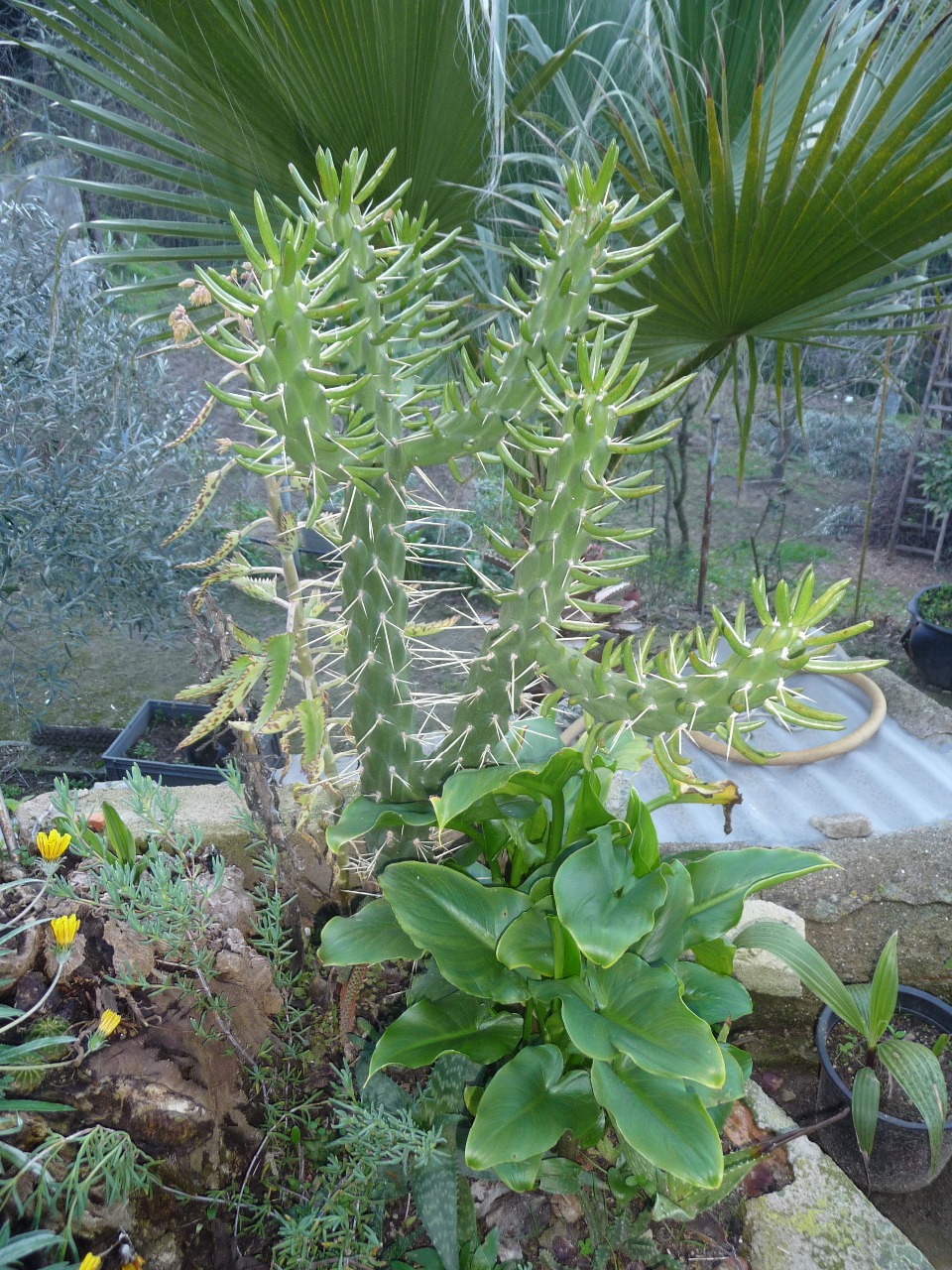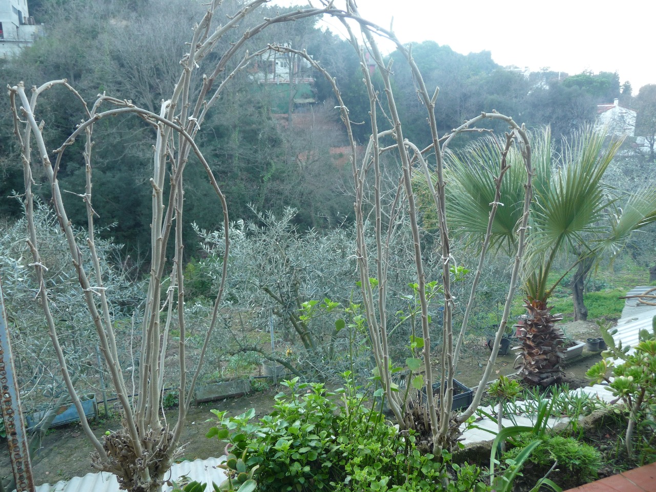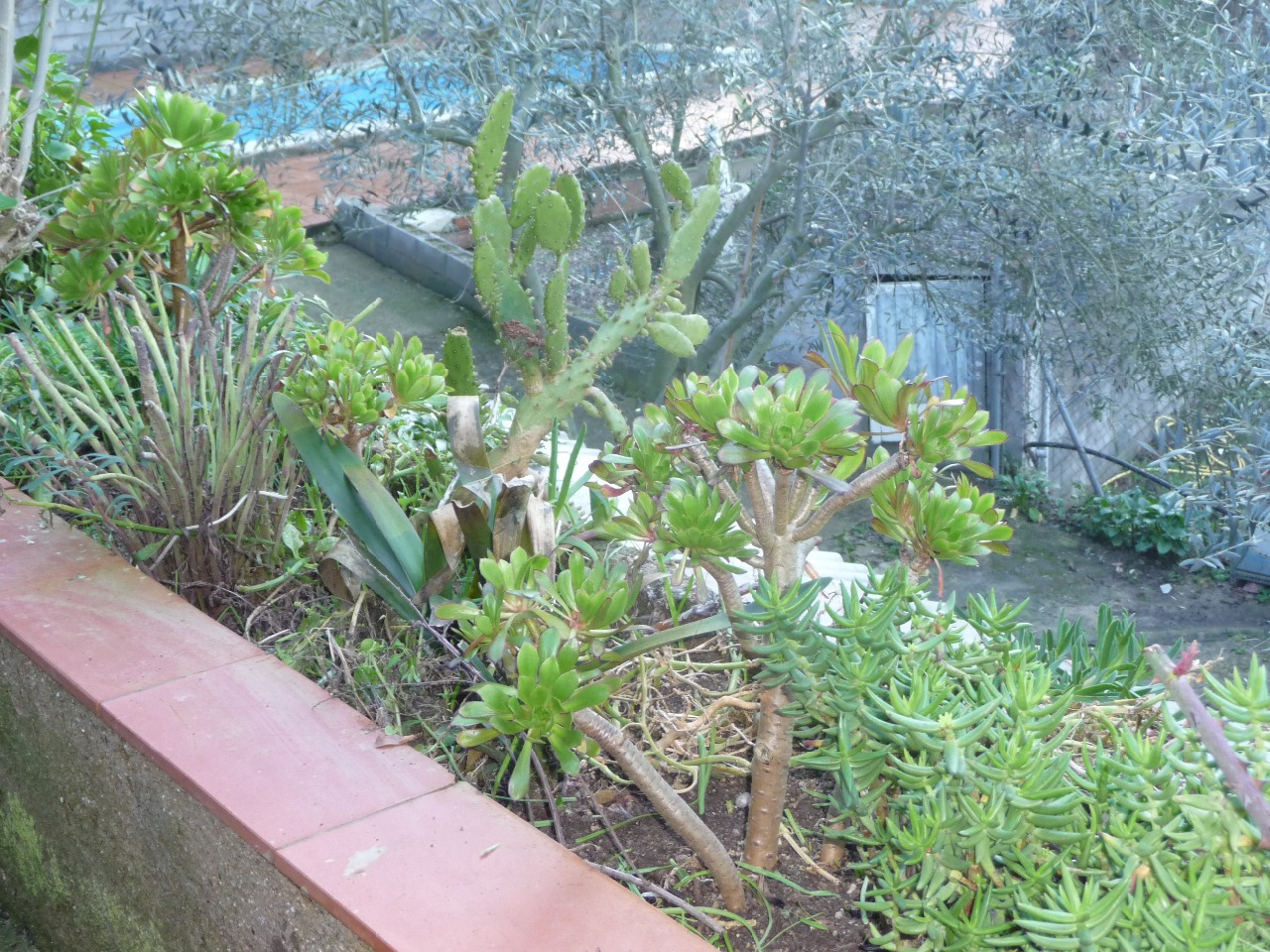 La primera foto es un detalle de un invernadero improvisado que da algo de protección a las plantas más delicadas durante los meses más fríos del año. Hay algunos cactus o crasas porque fuera muchas sucumben no tanto por el frío sino que por la elevada humedad ambiental que las pudre. En la de al lado, se aprecian más aeonios bastante más ramificados, unas cuantas Crassula tetragona que parecen resistir sin problemas al aire libre, una Euphorbia nativa que podé ya que ocupaba bastante, una de tantas clívias (Clivia x cyrtanthiflora) en este caso algo dañada por las heladas al estar en un sitio tan expuesto y una de las cuatro especies de opuntia que hay en la finca, Opuntia monacantha (las otras son el cardenche, la Opuntia microdasys y la chumbera).