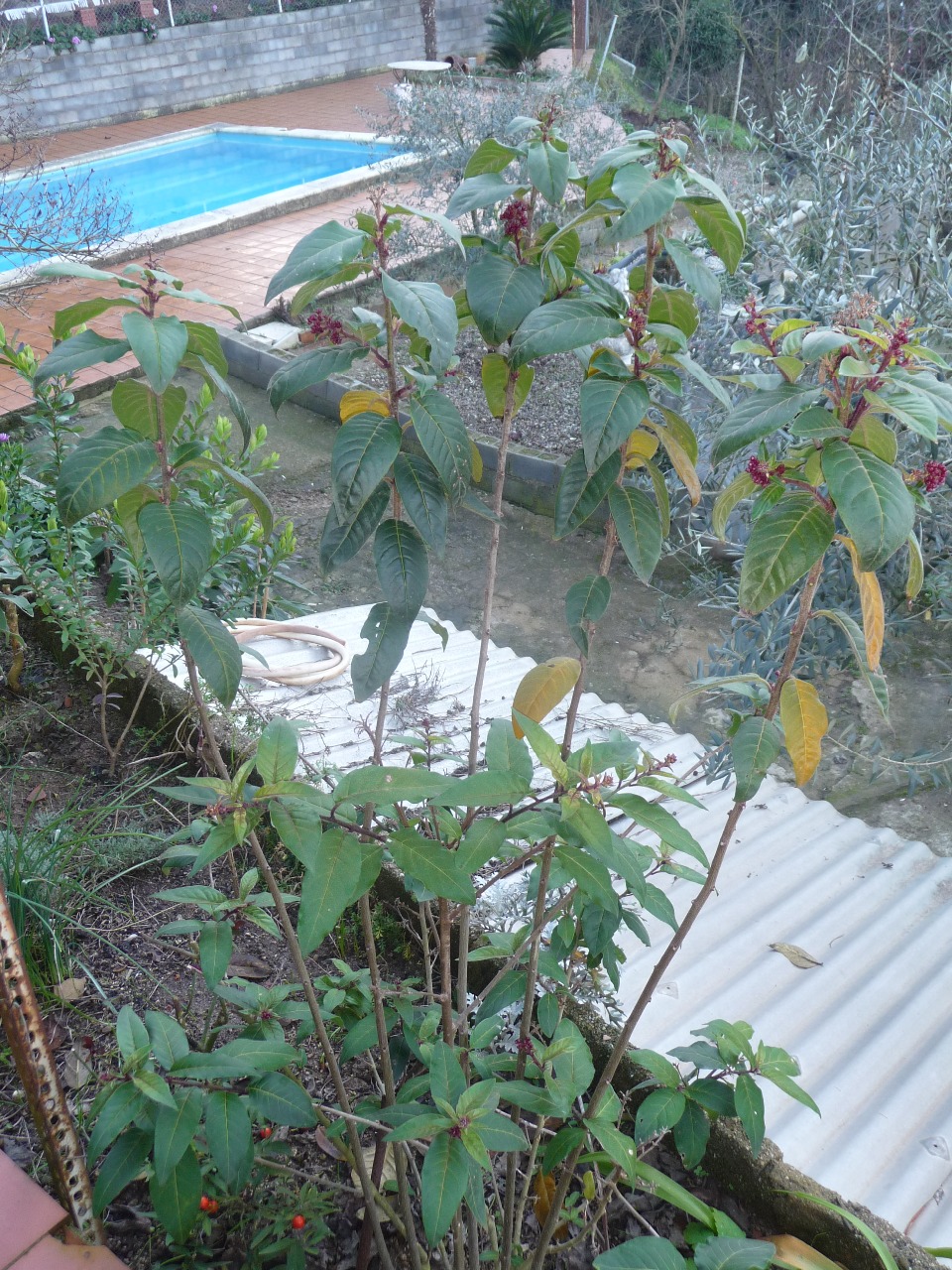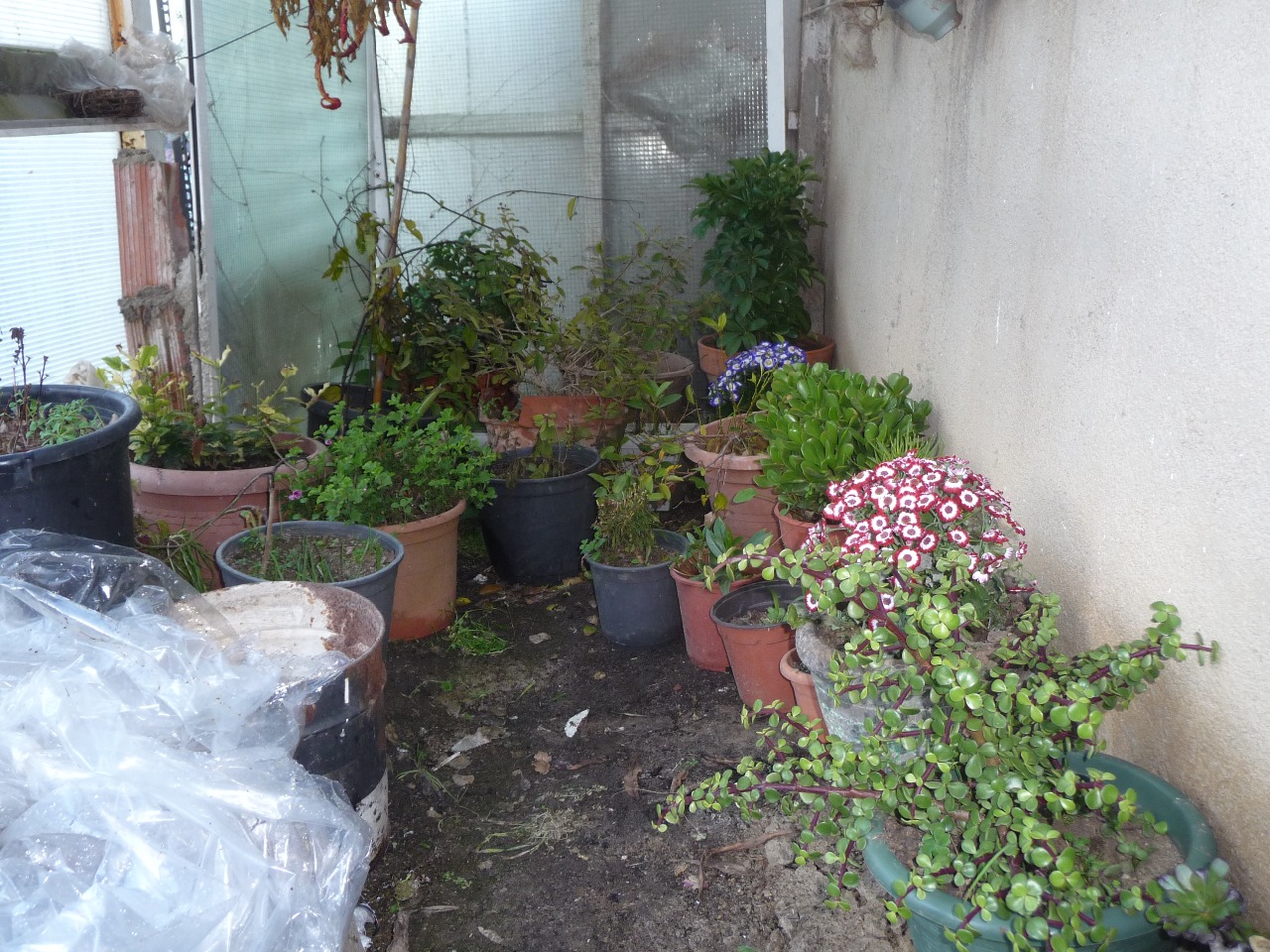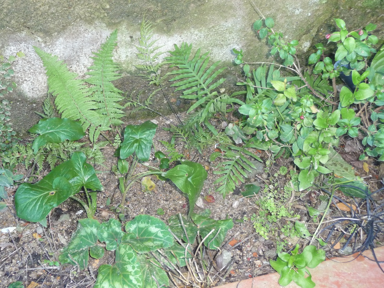 En la primera foto volvemos a ver un rincón dedicado en su mayoría a plantas nativas de las zonas más frescas y húmedas de la finca, como varias especies de helechos (Polypodium sp., Dryopteris filix-mas y la otra especie muy común que ahora no me acuerdo) y aros, tal vez Arum italicum o Arum maculatum. Sin embargo, se encuentran rodeadas de Ciclámenes (Cyclamen persicum y Cyclamen hederifolium), una vinca (Vinca major), un Ficus pumila "variegata", dos fúcsias o pendientes de la reina, una calaminta también nativa, una Gaultheria mucronata, dos Ophiopogon japonicus y un Ophiopogon planiscapus. En el lado derecho, aunque no se vea, hay una camelia con bastanes capullos. Para acabar en la última foto, se ven las hojas bastantes bonitas de unos cólquicos (Colchium autummale) que me dio una mujer desde teruel, que echan después de dar unas hermosas flores rosas en otoño. También, se ve una begonia pequeña, la planta del incienso (Plectranthus coleoides) y dos especies de Kalanchoes, una de ellas Kalanchoe daigremontiana, ambas echando los capullos florales y que están protegidos del frío. Aunque no se vean, hay más hortensias y una peonia. El problema con esta última es que siempre echa unas cuantas hojas y ya está, supongo que para desarrollarse bien necesita bastante más frío y menos calor en verano. Pasa lo mismo con los dos arándanos azules de la piscina, están prácticamente igual cada año y casi no florecen.
