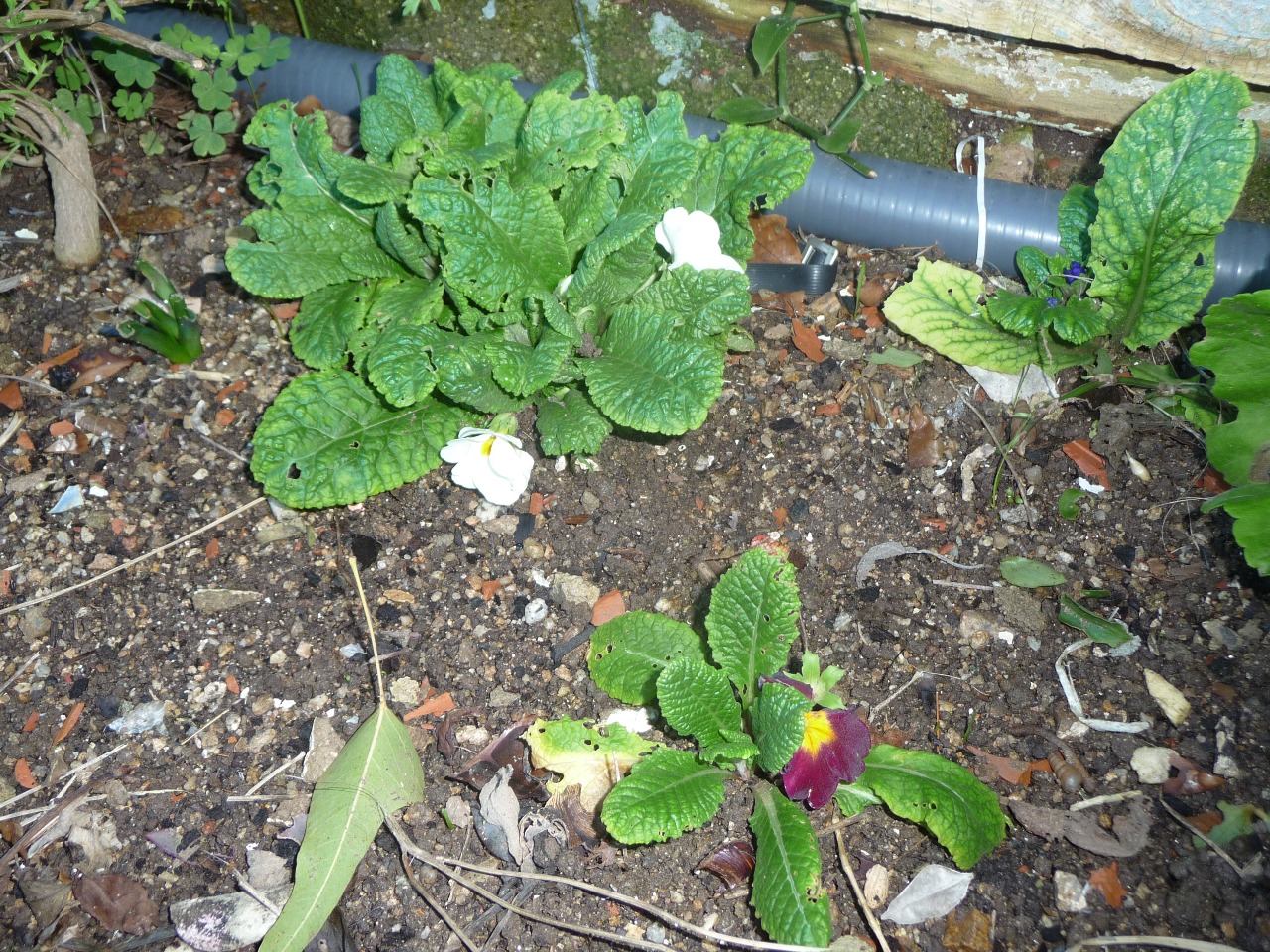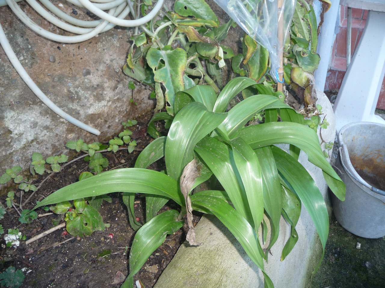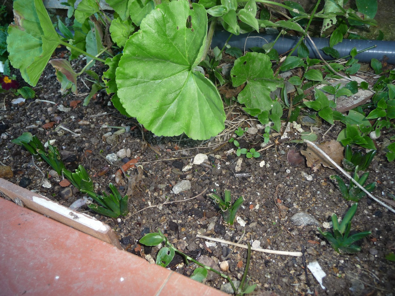 En la primera foto volvemos a ver un rincón dedicado en su mayoría a plantas nativas de las zonas más frescas y húmedas de la finca, como varias especies de helechos (Polypodium sp., Dryopteris filix-mas y la otra especie muy común que ahora no me acuerdo) y aros, tal vez Arum italicum o Arum maculatum. Sin embargo, se encuentran rodeadas de Ciclámenes (Cyclamen persicum y Cyclamen hederifolium), una vinca (Vinca major), un Ficus pumila "variegata", dos fúcsias o pendientes de la reina, una calaminta también nativa, una Gaultheria mucronata, dos Ophiopogon japonicus y un Ophiopogon planiscapus. En el lado derecho, aunque no se vea, hay una camelia con bastanes capullos. Para acabar en la última foto, se ven las hojas bastantes bonitas de unos cólquicos (Colchium autummale) que me dio una mujer desde teruel, que echan después de dar unas hermosas flores rosas en otoño. También, se ve una begonia pequeña, la planta del incienso (Plectranthus coleoides) y dos especies de Kalanchoes, una de ellas Kalanchoe daigremontiana, ambas echando los capullos florales y que están protegidos del frío. Aunque no se vean, hay más hortensias y una peonia. El problema con esta última es que siempre echa unas cuantas hojas y ya está, supongo que para desarrollarse bien necesita bastante más frío y menos calor en verano. Pasa lo mismo con los dos arándanos azules de la piscina, están prácticamente igual cada año y casi no florecen.