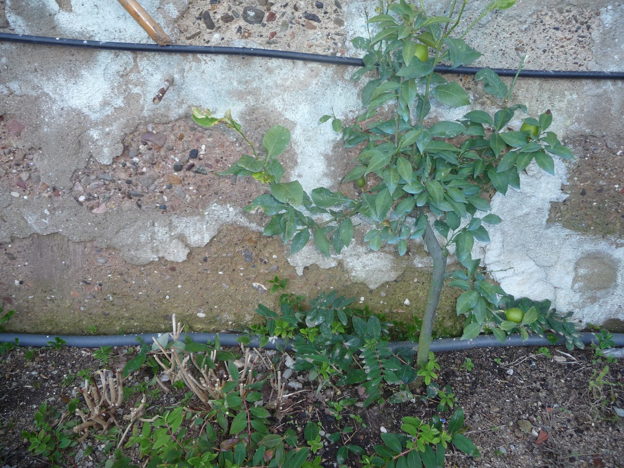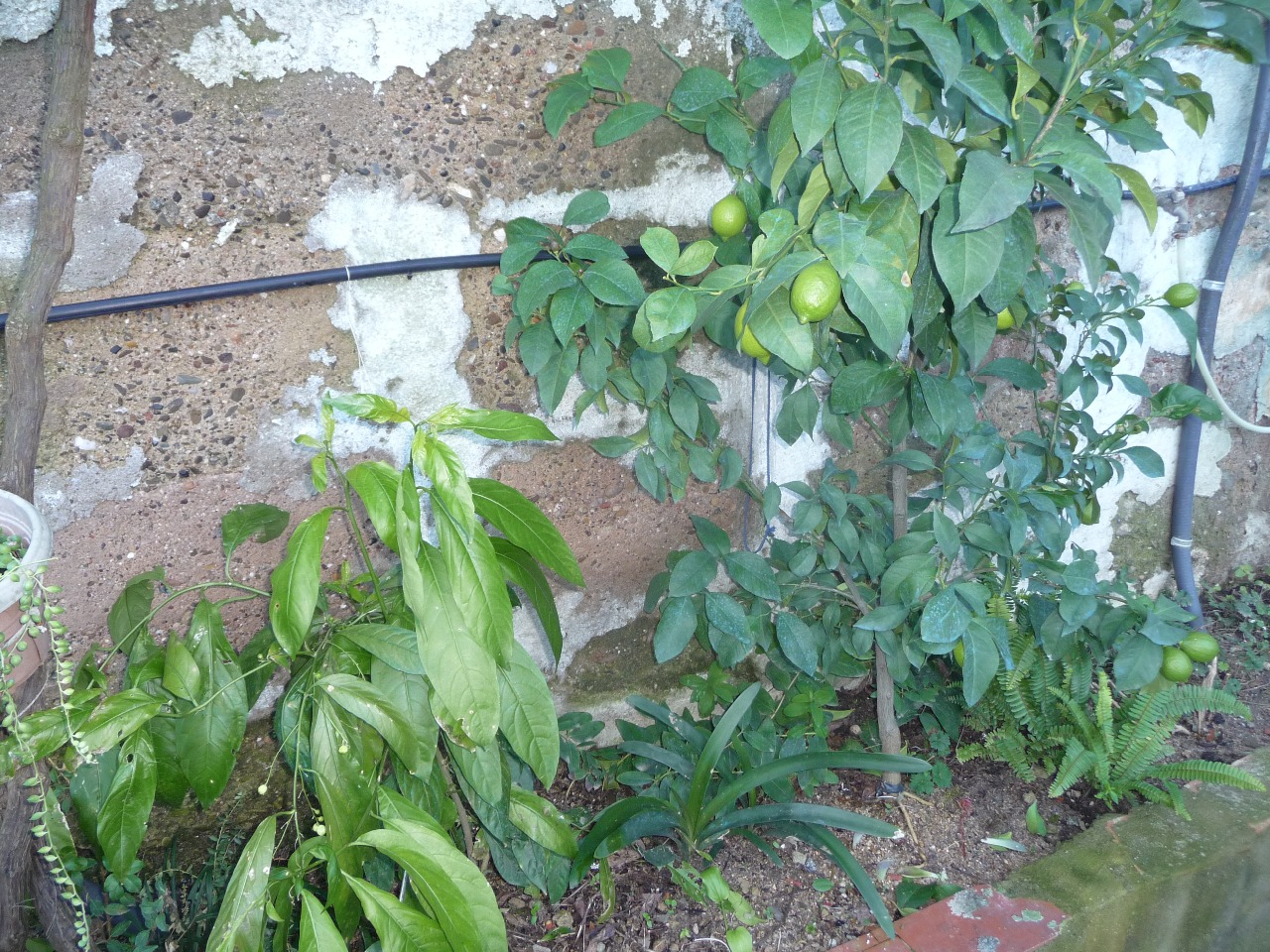 De vuelta al arriate izquierdo, después de pasar la Fatsia japonica, el Sedum spectabile y una begonia roja rodeada por orégano, nos encontramos con una dama de noche (Cestrum nocturnum) y unas clivias que han superado el invierno hasta ahora en perfecto estado. Esperemos que logren superar lo que queda igual de bien. Es más, una de estas clivias ya está empezando a echar flores. Al lado, tenemos otro limonero más grandes y con más limones que el anterior y bajo sus pies tenemos unos Nephrolepis cordifolia y una pequeñísima hepática (Hepatica nobilis) que me traje de Montserrat. Espero que cuando llegue la primavera se espavile y florezca. La dama de noche es el Cestrum más sensible al frío de los tres que hay: Cestrum fasciculatum y Cestrum parqui (en el arriate derecho).