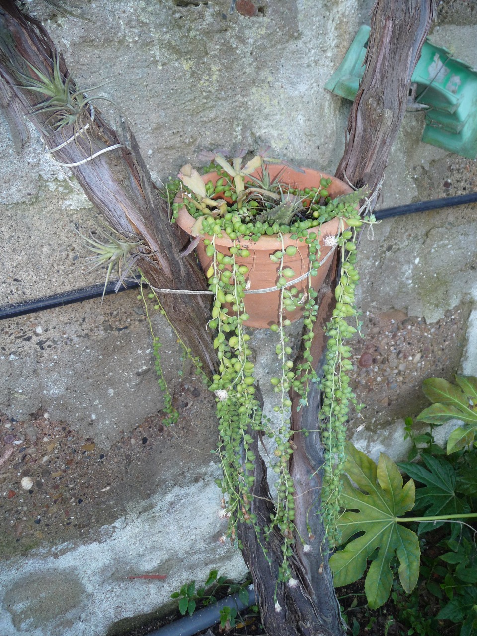 También hay un pequeño limonero con algunos limones, unas hortensias podadas, algunos hipéricos, una Nepeta cataria podada y un milenrama de flores blancas (Achillea milleflorum). A partir de aquí ya empiezan las parras y todo lo que está debajo suyo se convierte en una zona de sombra durante el mes de verano para las plantas más delicadas a los intensos rayos de sol que hay durante los meses cálidos. Los pies que se ven en la foto corresponden a una parra moscatel que desafortuandamente murió, pero sirve para colgar algunos claveles de aire (Tillandsia aeranthos) y una maceta con algunas estapelias, cactus de navidad (Schlumbergera truncatus) y plantas rosario (Senecio rowleyanus) que están en flor.